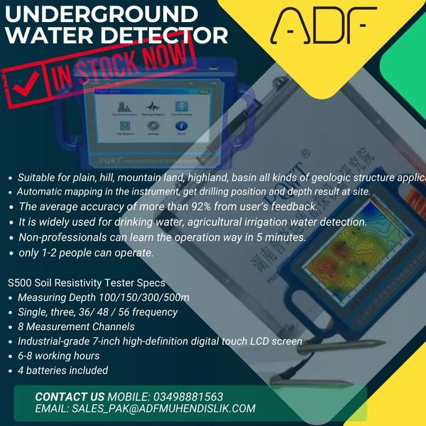 A soil resistivity method water detector is available for sale from PQWT, China, a leading manufacturer in water testing devices, having a depth of 500m and multiple frequency range incorporated with 7 in industrial grade touch screen and 8 Channels.